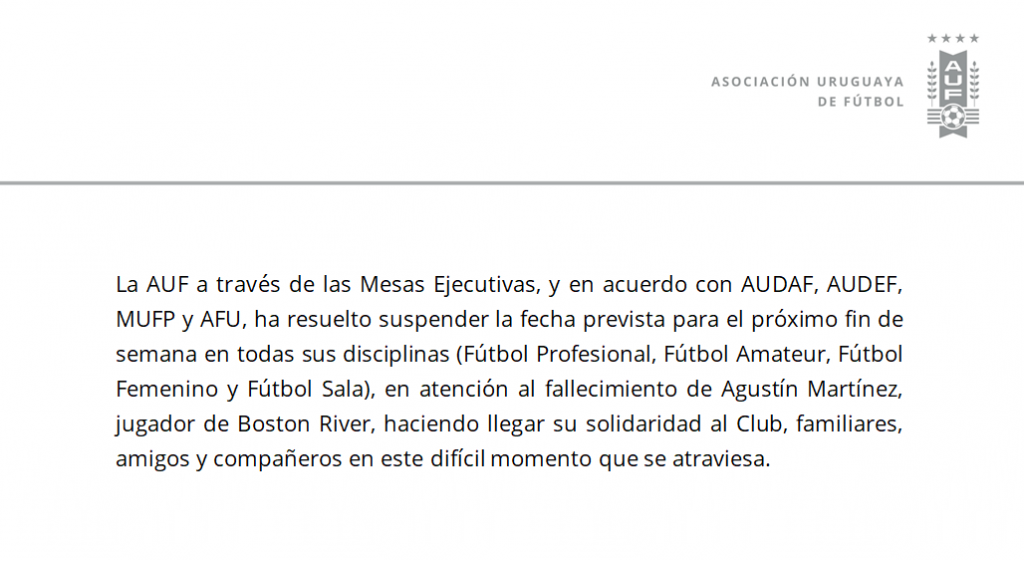 Se suspendió la actividad de campeonatos AUF del próximo fin de semana por duelo